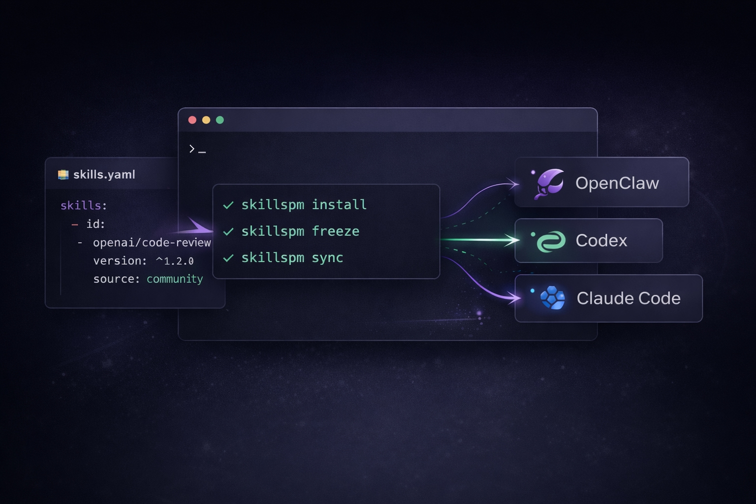 skillspm freezewrites the resolved state intoskills.lockskillspm syncpushes the installed environment from.skillsto one or more agents